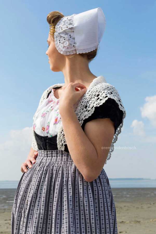 Een vredig en klassiek beeld van een model in blauw-witte traditionele Walcherse dracht, staand op het strand. Het zachte licht en de kalme sfeer creëren een harmonieus geheel, waarbij de zee een serene achtergrond biedt.