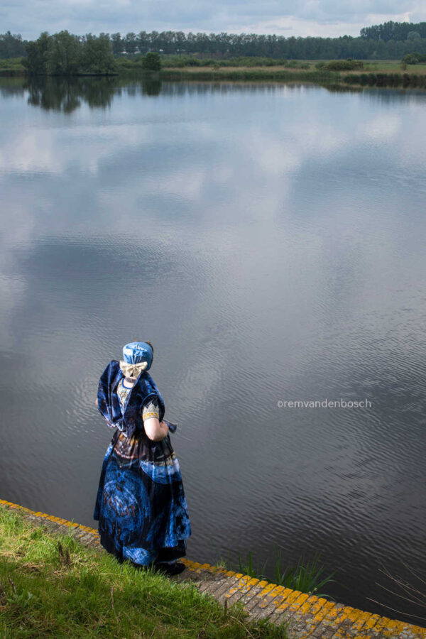 Een model in blauw-witte variant van de traditionele Axelse dracht, gefotografeerd aan een stille waterkant. Het beeld straalt een diepe verbinding met de natuur uit.