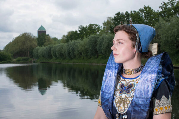 Een model in blauw-witte traditionele Axelse dracht, gefotografeerd aan het water met natuurlijke reflecties. Het beeld straalt kalmte en een diepere natuurverbinding uit.