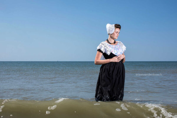 Dit inspirerende werk van Rem van den Bosch toont een model in zwart-witte traditionele Walcherse dracht, staand in de zee. De verfrissende en serene uitstraling van het beeld benadrukt de diepe verbondenheid met de natuur. Rem’s artistieke visie legt niet alleen het fysieke, maar ook het emotionele aspect van de connectie met de zee vast. Dit beeld roept de kijker op om de kracht en stilte van de natuurlijke omgeving te omarmen.