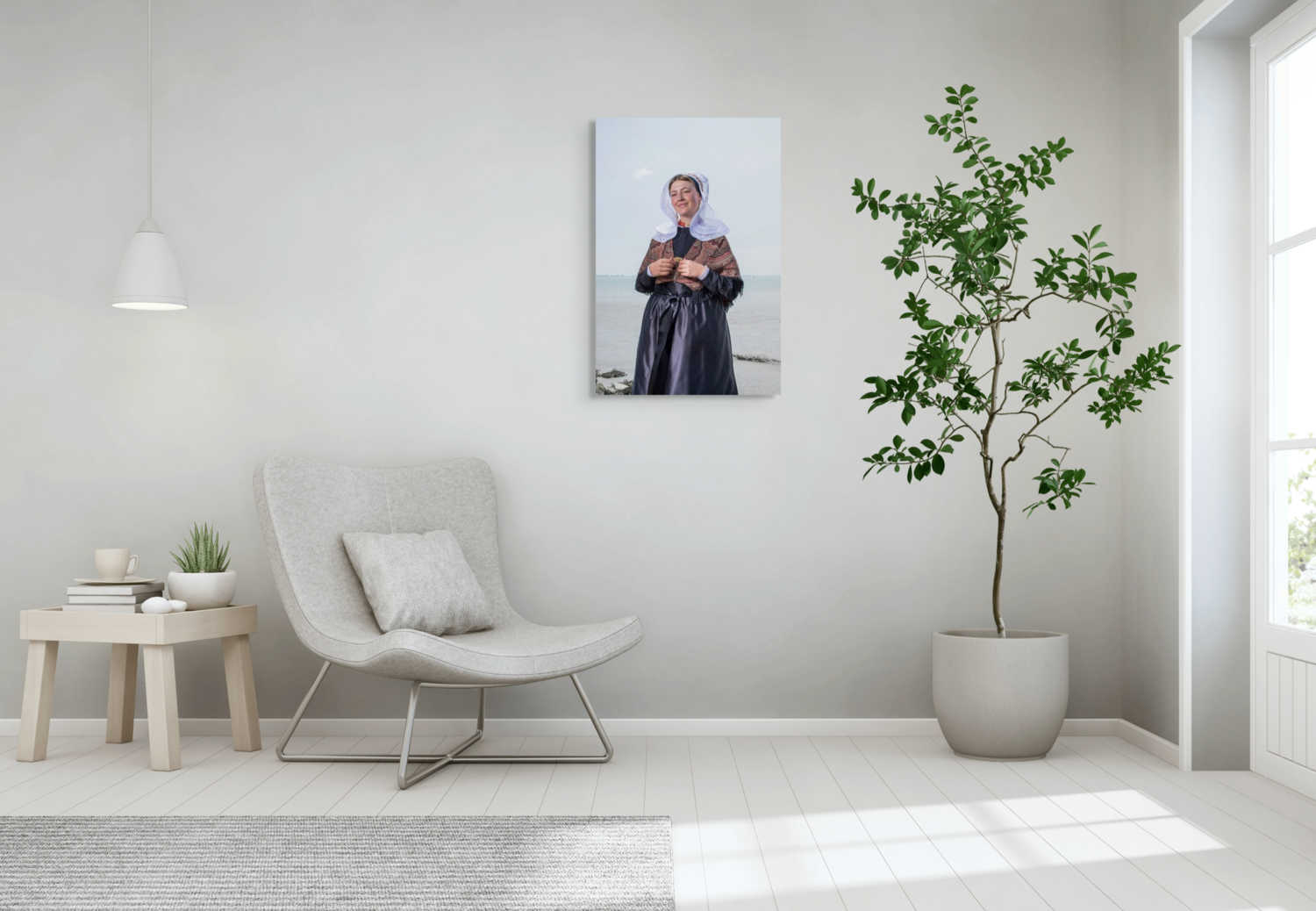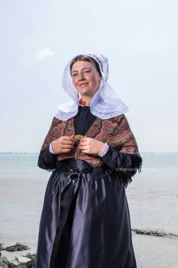 Een diepgaand en elegant beeld van een model in traditionele Hulster dracht, staand in het kustgebied. Dit werk toont een serene connectie met de natuur.