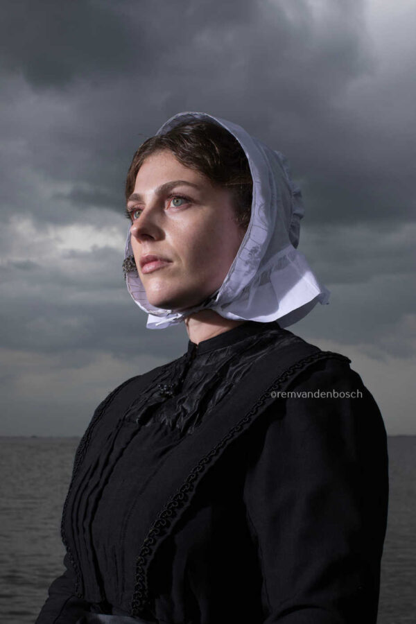 Rem van den Bosch legt in dit werk de diepgang en mysterie vast van een model in zwart-witte traditionele dracht van Cadzand, staand in een kustgebied onder een bewolkte hemel. De natuurlijke omgeving en de ingetogen kleuren versterken de verbondenheid met de natuur en de kalme kracht van het beeld. Rem’s oog voor sereniteit en eenvoud maakt dit werk een bron van stille mystiek en schoonheid.