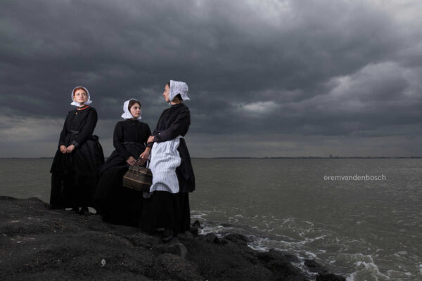 Rem van den Bosch legt de mystieke kracht van de natuur vast in deze opname van drie modellen in zwart-witte dracht, staand aan de kust onder dreigende wolken. Het dramatische contrast tussen de dracht en de donkere lucht versterkt het gevoel van mysterie en kracht. Rem’s oog voor compositie en contrast brengt een diepe, intense sfeer in beeld, wat dit werk een indrukwekkende en tijdloze uitstraling geeft.