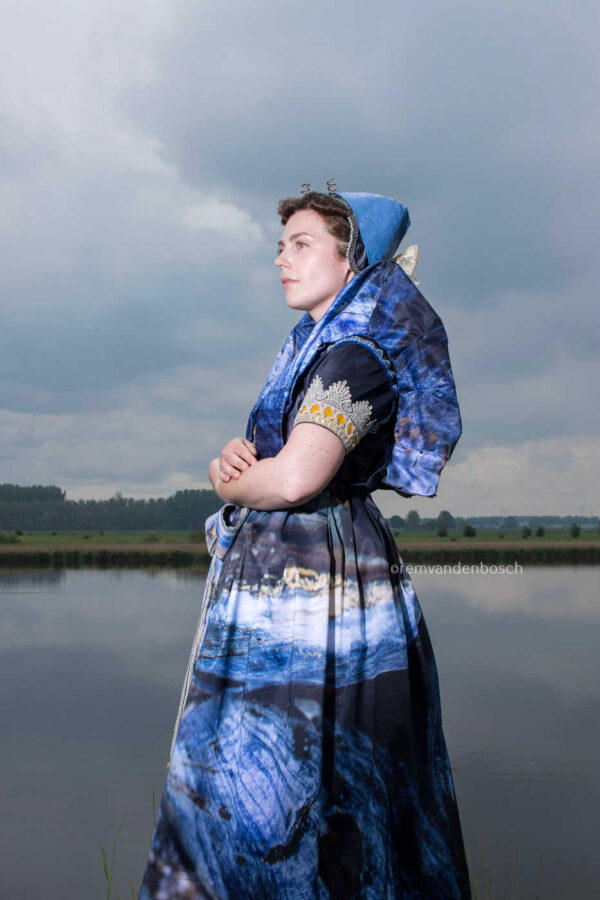 Een model in blauw-witte traditionele Axelse dracht, gefotografeerd aan het water met een open hemel. Het beeld straalt eenvoud en harmonie uit.