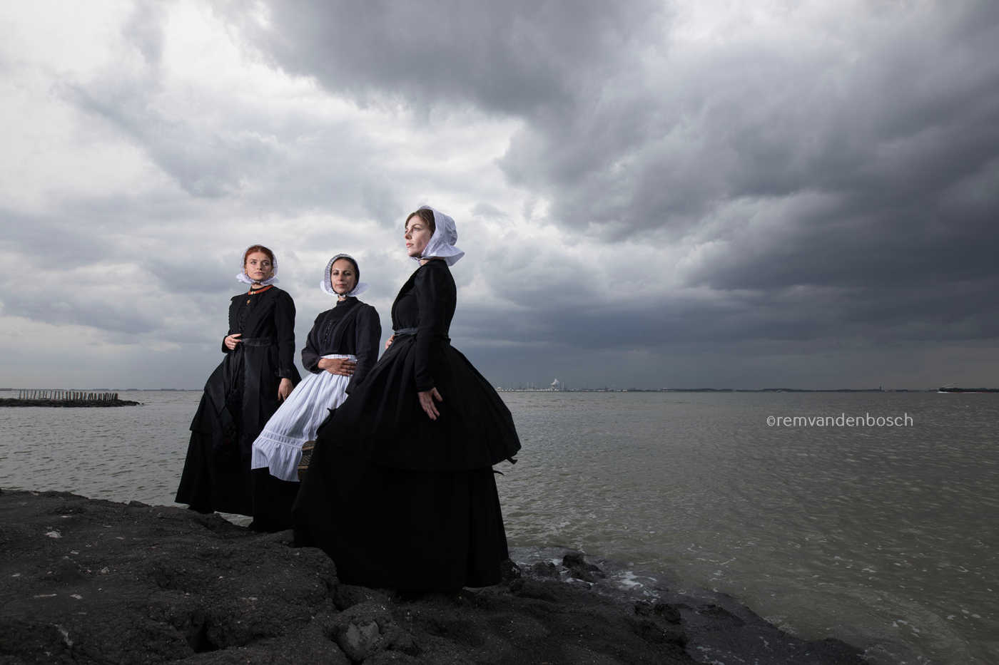 In deze robuuste opname van Rem van den Bosch staat een model in blauw-witte Friese traditionele dracht voor een stapel houten boomstammen. De natuurlijke uitstraling van het beeld benadrukt eenvoud en verbondenheid met de natuur, een uitnodiging om de schoonheid van het platteland te waarderen. Rem legt vaak de nadruk op de krachtige elementen van het landelijke leven, wat zijn foto’s een ruwe en authentieke sfeer geeft.