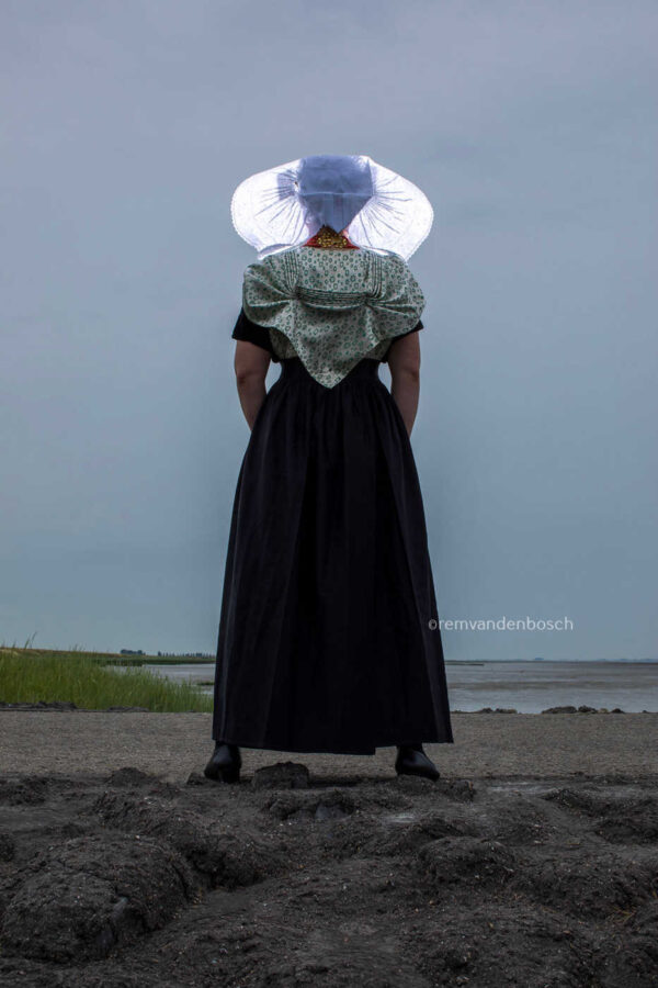 Een elegant en sereen beeld van Janis in de protestantse Zuid-Bevelandse dracht op een dijk, met een kalme uitstraling.