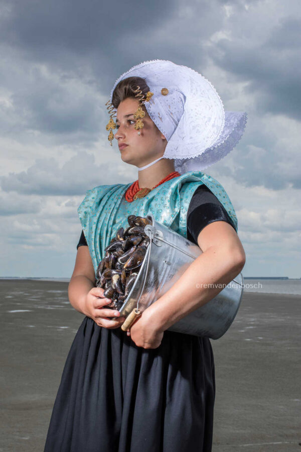Rem van den Bosch vangt in dit werk de elegante sereniteit van Merit in de lichtblauwe traditionele Nieuwlandse dracht, staand aan de kust met een emmer vol mosselen. De serene omgeving en subtiele kleuren versterken de verbondenheid met de natuur en het gevoel van rust. Rem’s oog voor eenvoud en natuurlijke schoonheid maakt dit werk een uitdrukking van tijdloze elegantie en verbondenheid.