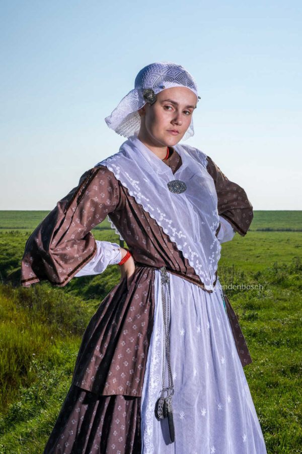 Een model in bruine en witte traditionele Friese dracht, gefotografeerd in een weide met natuurlijke lichtinval. Het beeld straalt waardigheid en schoonheid uit.