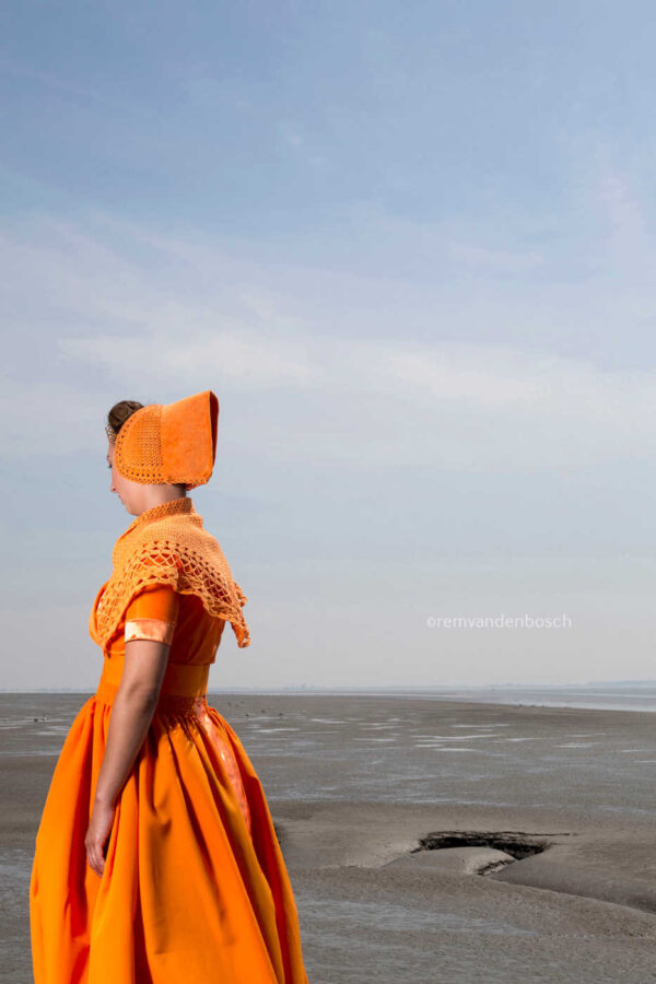 Rem van den Bosch vangt hier een gevoel van vreugde en speelsheid in de kustomgeving. Het model, gekleed in oranje traditionele Walcherse dracht, staat vol zelfvertrouwen en energie aan de waterkant. Rem’s werk benadrukt vaak de verbinding tussen cultuur en natuur, en in deze opname komt dat prachtig tot uiting. De warme kleur en de kustomgeving creëren een dynamisch geheel dat uitnodigt om de energie van de natuur te voelen en de vreugde van het moment te omarmen.