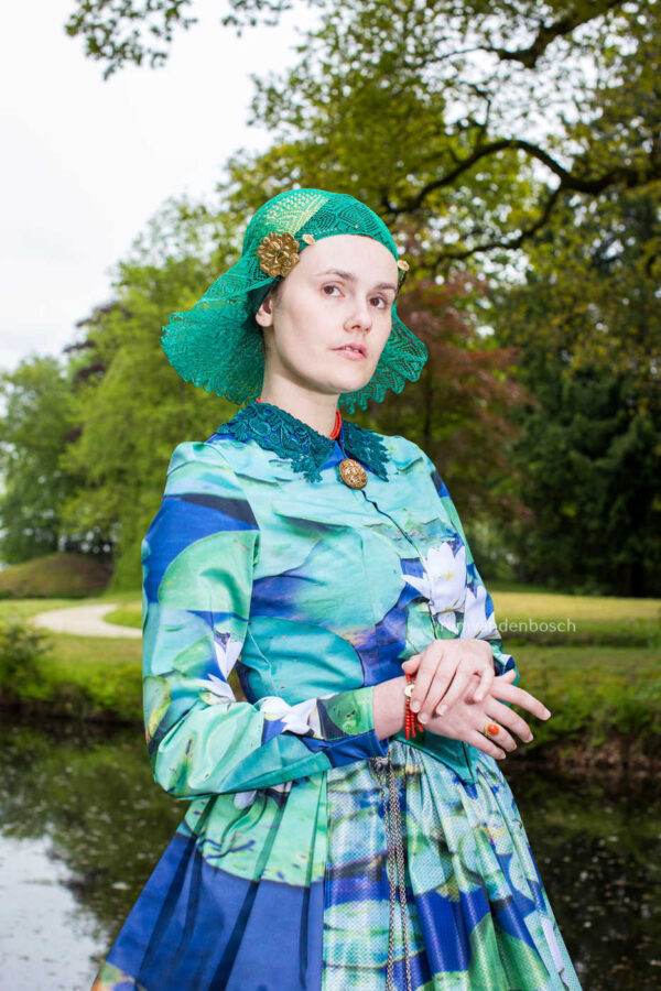 Gefotografeerd tegen een achtergrond van groen gebladerte straalt dit portret van een model in moderne groen-blauwe traditionele Friese dracht frisheid en levendigheid uit. Rem van den Bosch heeft de natuurlijke energie vastgelegd die uit dit werk spreekt, waardoor het een ideale toevoeging is voor een ruimte die natuur en vitaliteit waardeert. Betoverende Schoonheid voor Thuis en Kantoor: breng een unieke sfeer in uw huis of werkruimte met dit prachtige kunstwerk. Het biedt niet alleen vreugde, maar inspireert ook tot boeiende gesprekken. Kunst die het hart raakt en de ruimte compleet maakt.