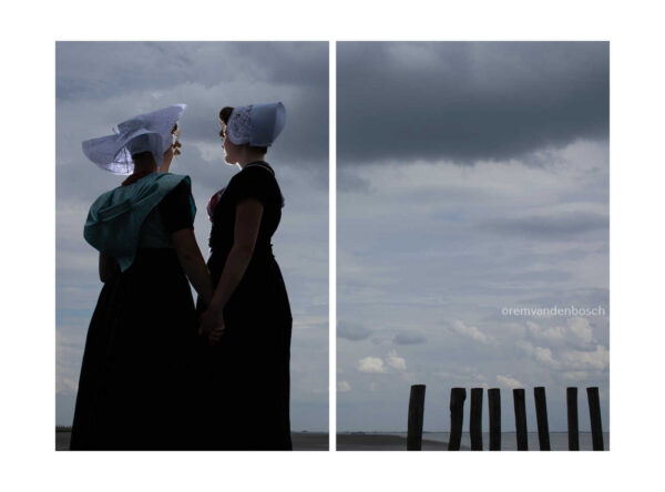 In dit werk van Rem van den Bosch zien we Kyra en Merit in klassieke Zeeuwse dracht, de Walcherse dracht en de Nieuwlandse dracht, hand in hand, met hun blikken naar de horizon gericht. De serene achtergrond van de zee en de eenvoudige paaltjes versterken de sfeer van verbondenheid en nostalgie. Het beeld nodigt de kijker uit om de tijdloze band tussen mensen en het landschap te voelen. Rem’s keuze voor deze ingetogen compositie benadrukt de schoonheid van traditie en de kracht van eenvoud.