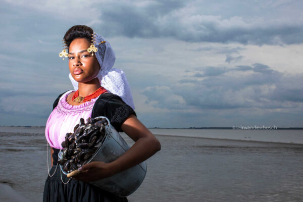 In dit prachtige beeld brengt Rem van den Bosch de harmonie en verbondenheid van het model en het leven aan de kust in beeld. De zwarte dracht, roze beuk met paars blauwe tinten geeft een frisse, traditionele uitstraling die perfect past bij de natuurlijke omgeving. Het model heeft een emmer met mosselen onder haar arm. Dit werk is ideaal voor ruimtes die een gevoel van samenzijn en sereniteit willen uitstralen.