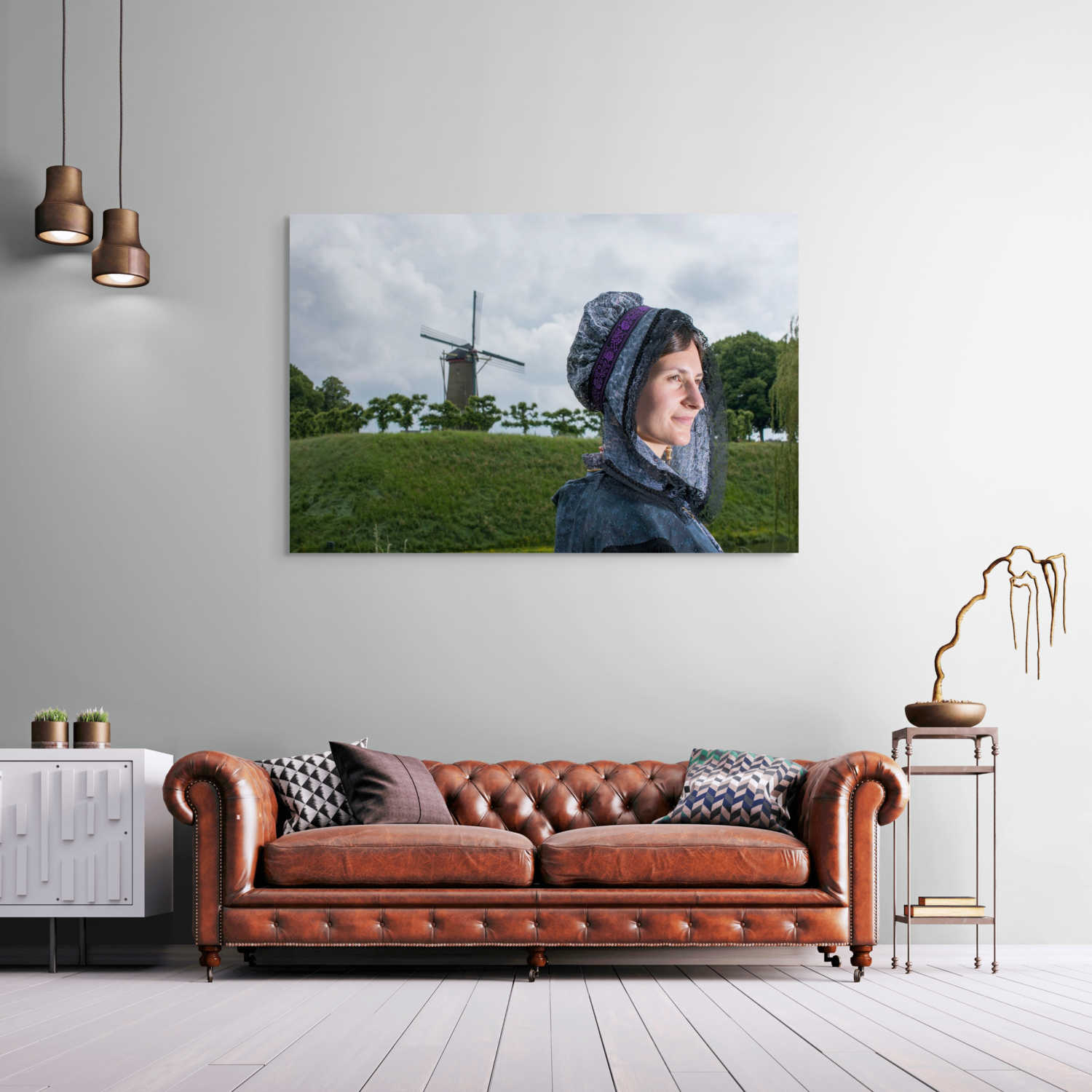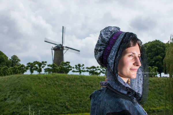 Rem van den Bosch brengt in dit portret de verbinding tussen traditie en natuur subtiel in beeld. Het model draagt een blauwe en witte dracht, en de windmolen op de achtergrond versterkt het erfgoedgevoel. De kalme uitstraling van dit werk weerspiegelt de toewijding van Rem aan het bewaren van cultureel erfgoed door middel van zijn fotografie. Dit beeld vindt een tijdloze plaats in elk interieur dat natuur en traditie waardeert.