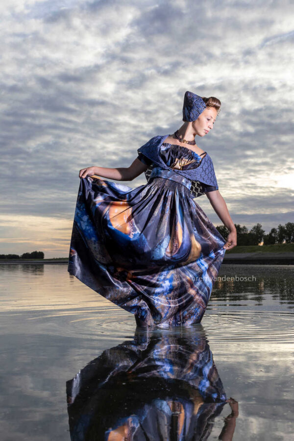 In deze serene opname van Rem van den Bosch staat een model in moderne blauwe variant van de Walcherse dracht met Mossel print bij reflecterend water in een kustgebied. De tijdloze uitstraling en rust maken dit werk perfect voor wie houdt van natuur en elegantie.