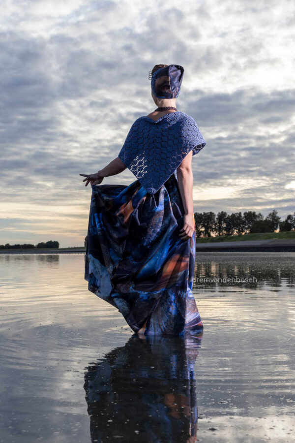 Deze opname van Rem van den Bosch toont een model in moderne blauwe variant van de Walcherse dracht met Mossel print, waarbij de reflectie op het natte zand een serene sfeer creëert. Ideaal voor wie een kalme en tijdloze schoonheid in zijn ruimte wil brengen.