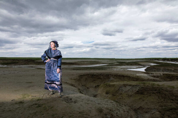 In dit introspectieve werk van Rem van den Bosch staat een model in moderne blauwe Hulster dracht onder donkere wolken. De rustige en natuurlijke sfeer van het beeld roept een kalme verbondenheid met de natuur op, ideaal voor wie diepgang en eenvoud zoekt.