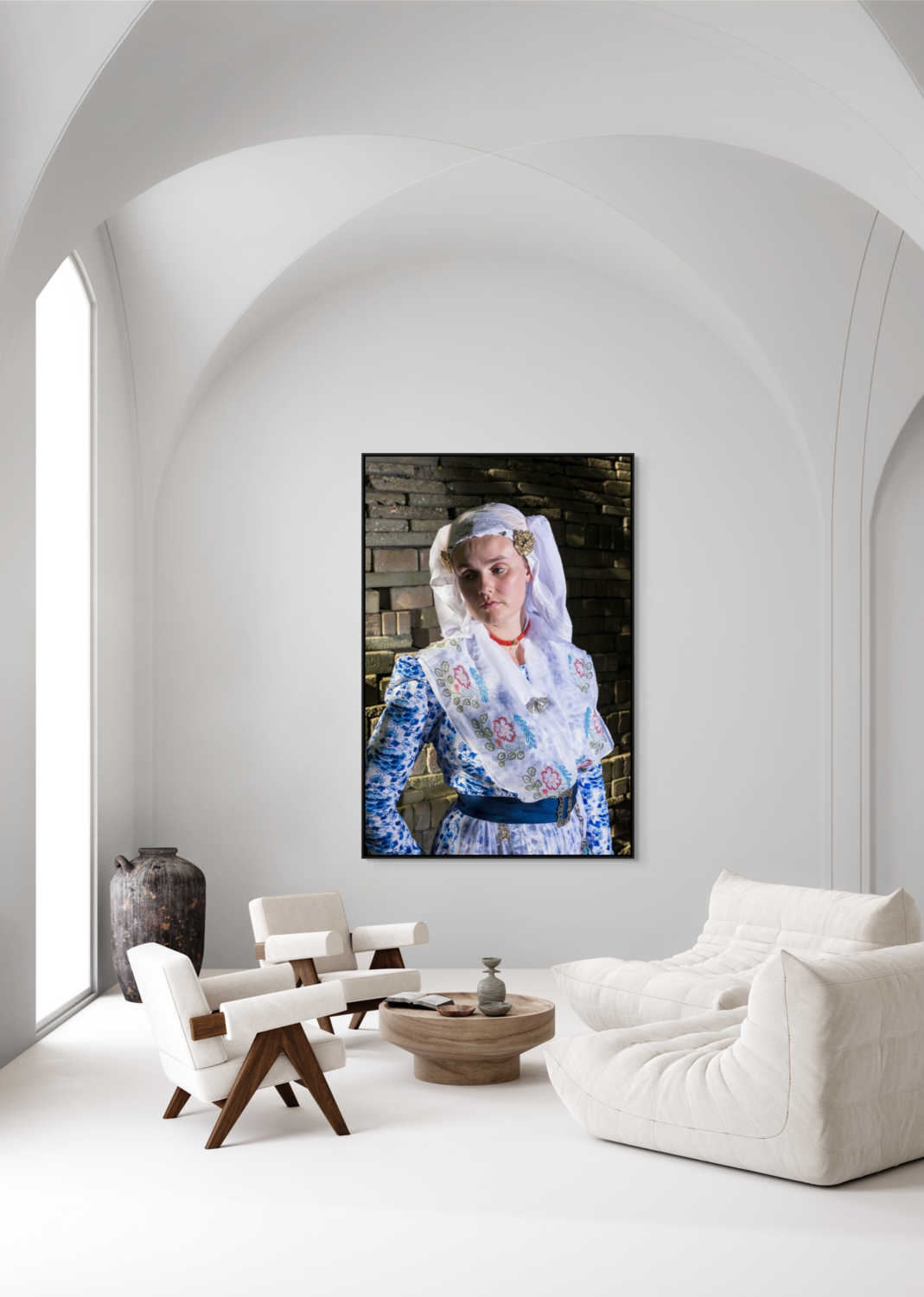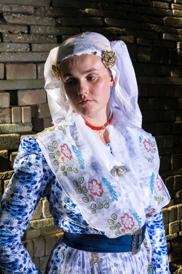 Deze klassieke portretopname van Rem van den Bosch toont een model in blauw-witte traditionele Friese dracht. De rustige en tijdloze uitstraling van het beeld belichaamt elegantie, waarbij de eenvoud van de achtergrond de schoonheid van de dracht benadrukt. Rem legt met zijn werk vaak de nadruk op de verfijning van traditionele stijlen, wat zijn foto’s een serene en elegante sfeer geeft.