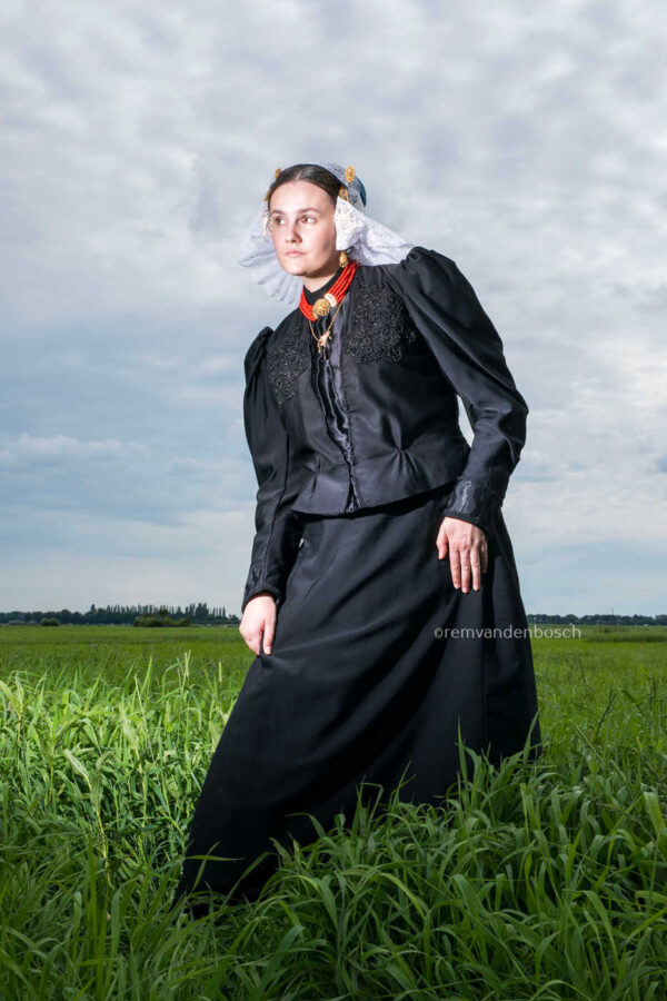 Een sereen en klassiek beeld van een model in zwarte dracht van Gooi-en Eemland. Het beeld straalt een diepe verbondenheid met het land uit.