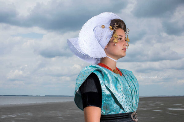 Rem van den Bosch vangt in dit werk de krachtige kalmte van een model in lichtblauwe traditionele dracht van Nieuwland, staand op het strand. De natuurlijke omgeving en ingetogen kleuren versterken de band met de natuur en het gevoel van rust. Rem’s oog voor eenvoudige, natuurlijke schoonheid maakt dit werk een uitdrukking van tijdloze elegantie en kracht.
