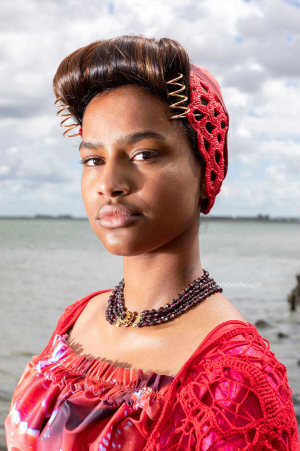 Een model in moderne rode Walcherse klederdracht, gefotografeerd aan het strand. Het beeld straalt kracht en zelfvertrouwen uit, met een trotse uitstraling.