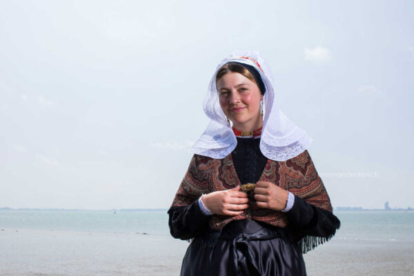 Een krachtig en tijdloos beeld van een model in traditionele Hulster dracht, geplaatst op het strand. Dit werk straalt een rustige uitstraling uit.