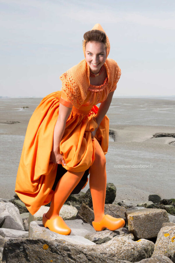 Een speels en ondeugend beeld van Ruby in oranje traditionele Walcherse dracht, dat de kracht van natuur en traditie combineert aan de kust. De verbondenheid met de omgeving en de levendige kleur brengen vreugde en energie over.