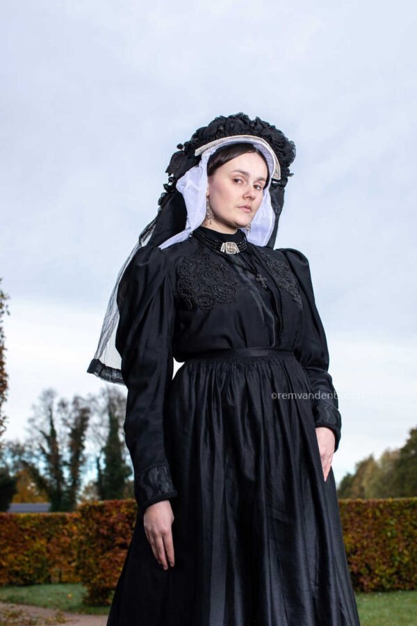 Een model in zwarte dracht van Limburg, gefotografeerd tegen een natuurlijke achtergrond. Het beeld straalt een krachtige en ingetogen sfeer uit, vol mysterie en diepte.