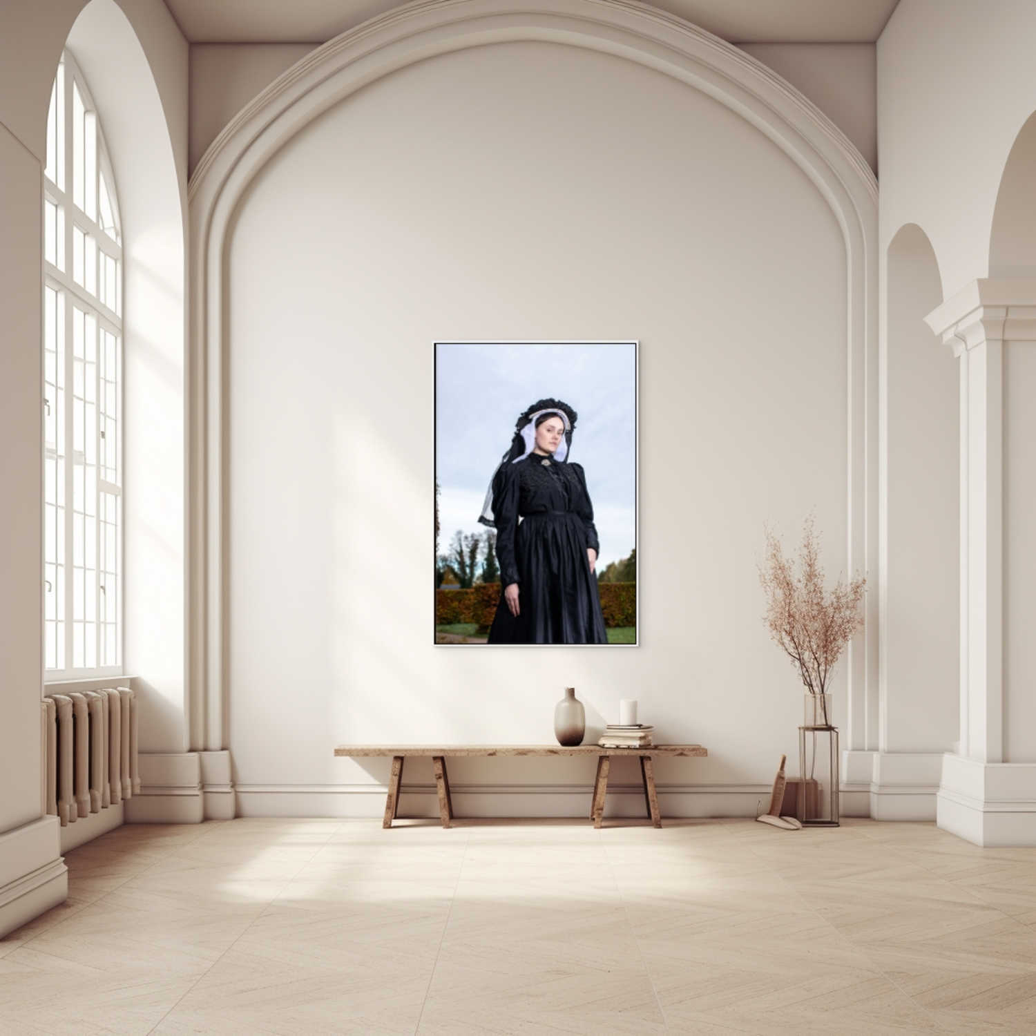 In deze portretopname heeft Rem van den Bosch een model in zwarte dracht van Limburg vastgelegd tegen een natuurlijke achtergrond. De krachtige en ingetogen uitstraling van het beeld roept gevoelens van mysterie en diepte op, waarbij de klassieke uitstraling van zwart een serene en tijdloze kwaliteit toevoegt aan het portret. Rem’s keuze voor de natuur als achtergrond versterkt het mystieke karakter van de opname, waardoor het beeld zowel intrigerend als elegant is.
