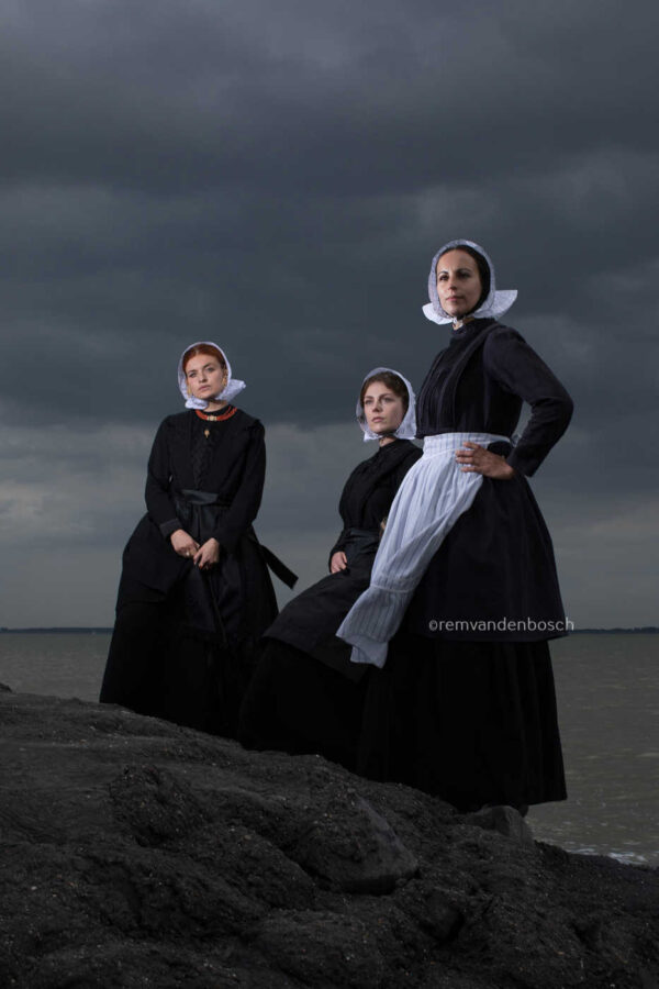 Rem van den Bosch legt in dit werk de mysterie en verbondenheid van drie modellen in zwart-witte traditionele dracht van Cadzand vast, staand onder een bewolkte hemel in een kustgebied. De intense sfeer en de ingetogen kleuren benadrukken het gevoel van traditie en verbondenheid. Rem’s oog voor diepgang en contrast maakt dit werk een krachtige uitdrukking van tijdloze schoonheid en traditie.