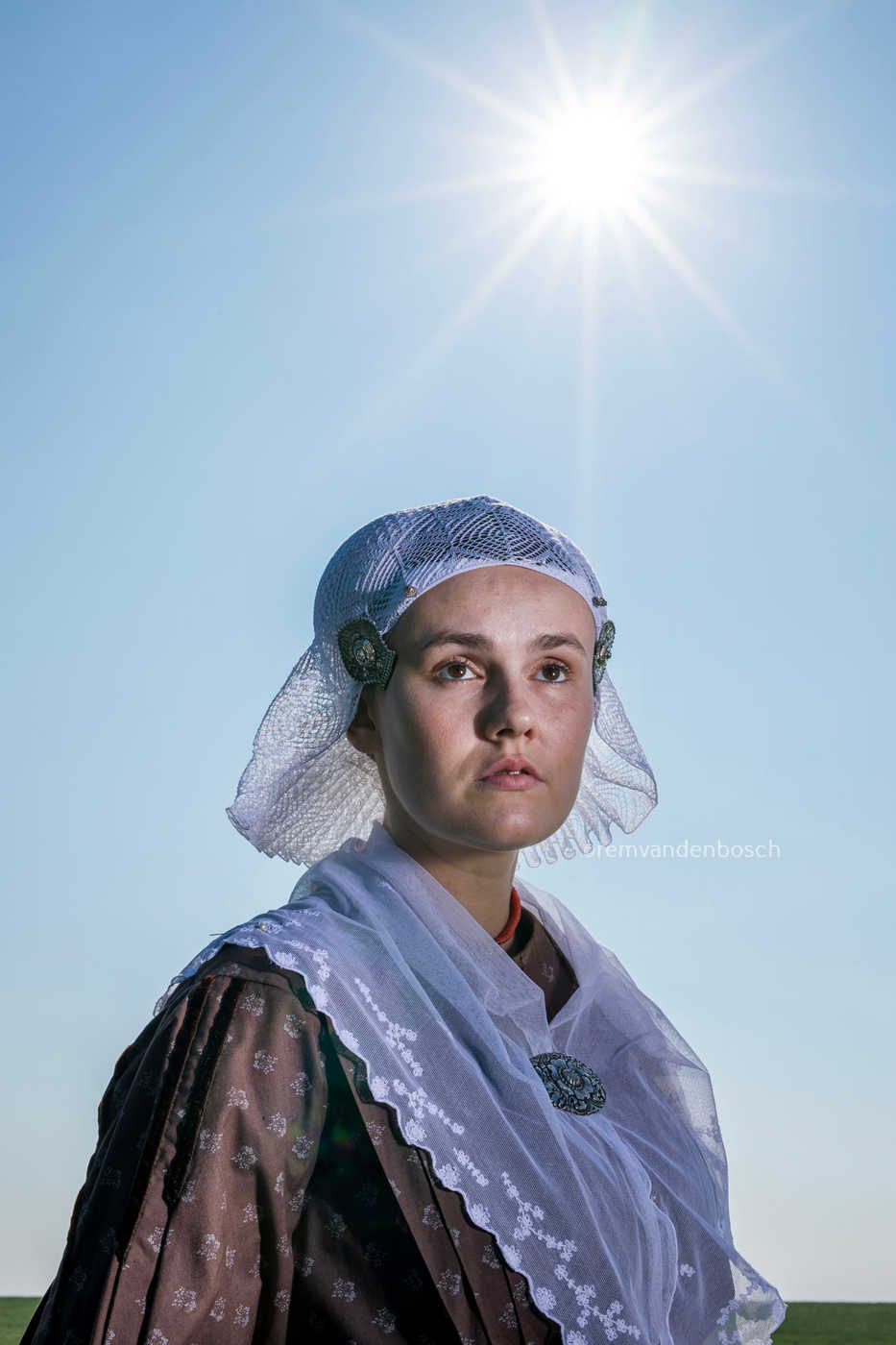 In dit mystieke en indrukwekkende portret weet Rem van den Bosch de verbinding met het Nederlands erfgoed op een unieke manier vast te leggen. Het model, gehuld in zwarte traditionele dracht van Gooi- en Eemland, staat in een uitgestrekt natuurlijk landschap, wat een gevoel van rust en majesteit oproept. Ideaal voor een interieur dat zowel traditie als mysterie waardeert.