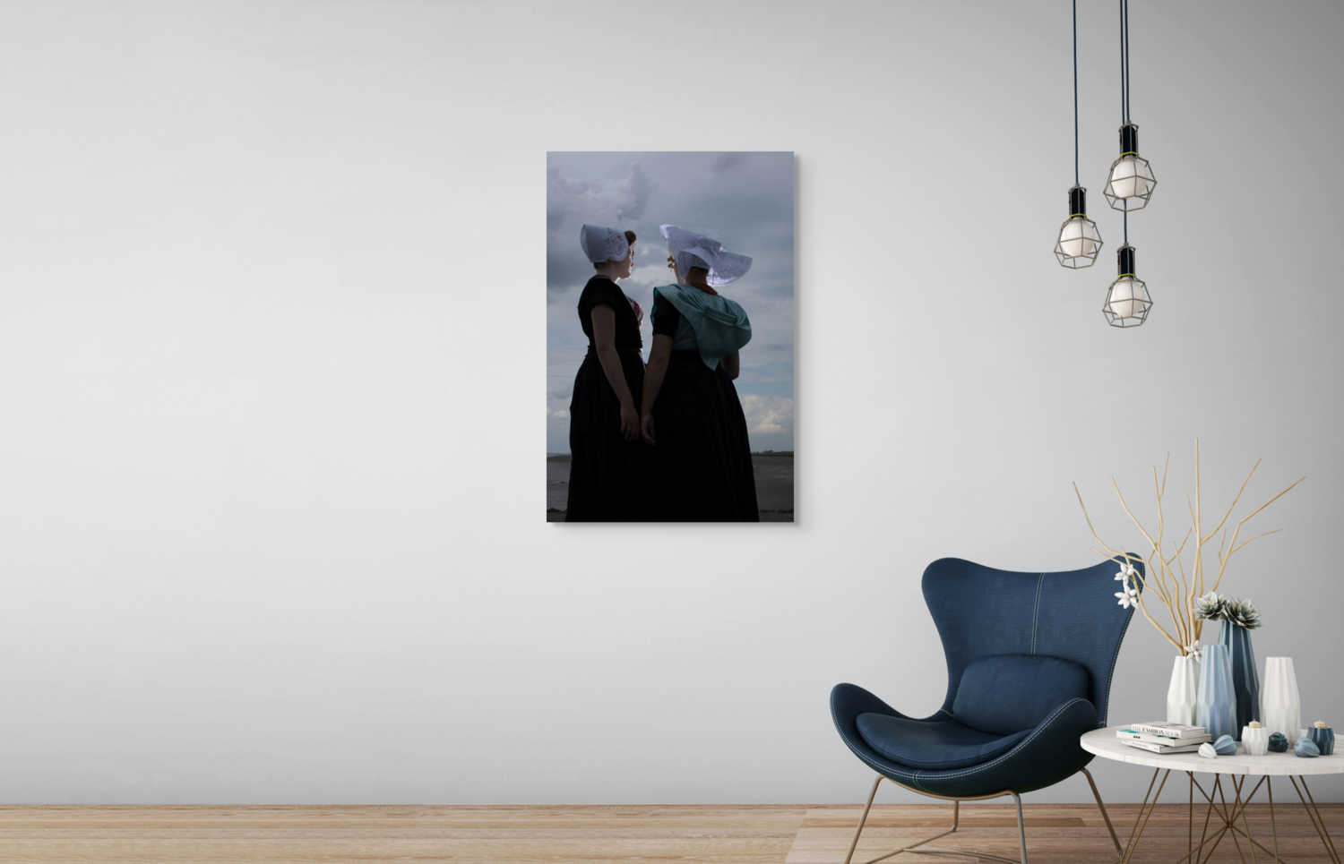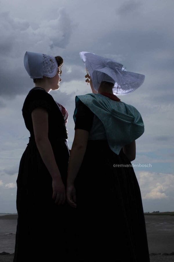 Rem van den Bosch legt in dit werk de mysterie en kracht vast van twee modellen in zwart-witte traditionele dracht van Walcheren en Nieuwland, staand op het strand onder een dramatische lucht. De sterke contrasten en diepe verbinding met de natuur maken dit werk tot een krachtige uitdrukking van tijdloze elegantie en emotionele diepgang.