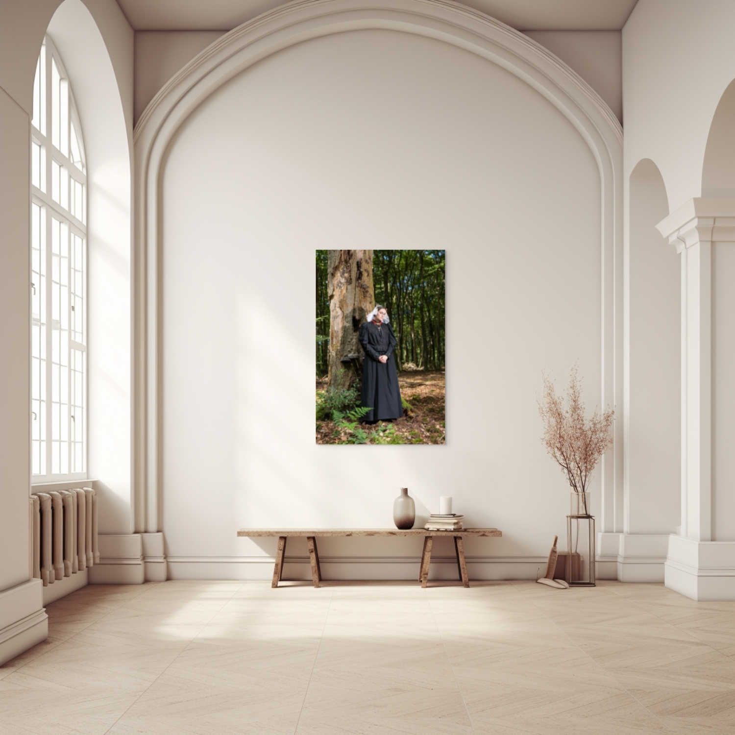 Rem van den Bosch heeft in dit portret de mysterieuze en serene sfeer van het bos vastgelegd. Het model, gekleed in de zwarte traditionele dracht van Gooi-en Eemland, staat omringd door bomen, wat een gevoel van kracht en verbondenheid met de natuur toevoegt. Dit werk is perfect voor een ruimte die mystiek en natuurlijke schoonheid wil uitstralen.