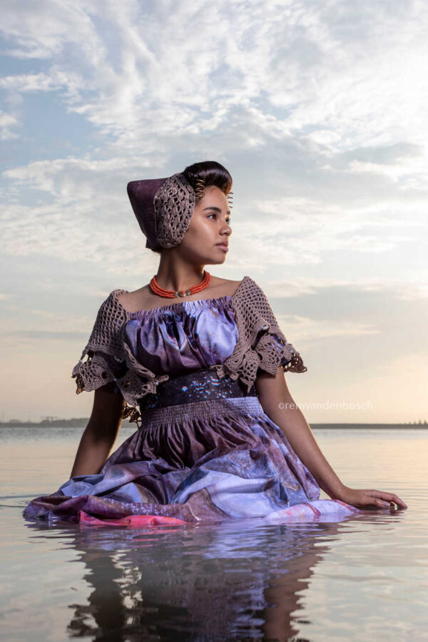 Een mysterieus en rustgevend beeld van een model in rood-roze traditionele Walcherse dracht, gefotografeerd in zee. De sfeer van de zee en de intensiteit van de kleuren maken dit tot een beeld vol stilte en diepgang.