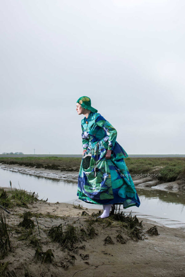 Een model in moderne groen-blauwe traditionele Friese dracht, gefotografeerd in de schorren van Friesland
