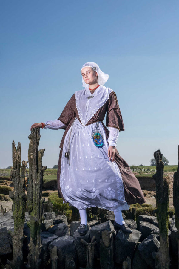 Hier poseert Linde in traditionele bruine en witte Friese dracht. Rem van den Bosch heeft in dit werk de eenvoud en sereniteit van het platteland weten vast te leggen. Zijn kunst is doordrenkt met een gevoel van harmonie en eerbied voor de natuur. Deze foto biedt een rustpunt en een verhaal van verbondenheid, perfect voor een ruimte die balans en eenvoud zoekt.