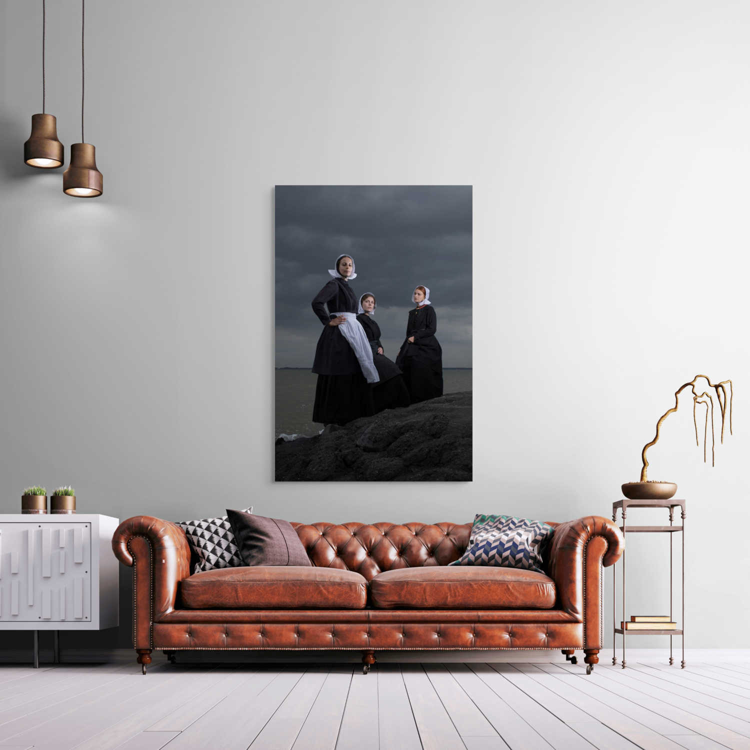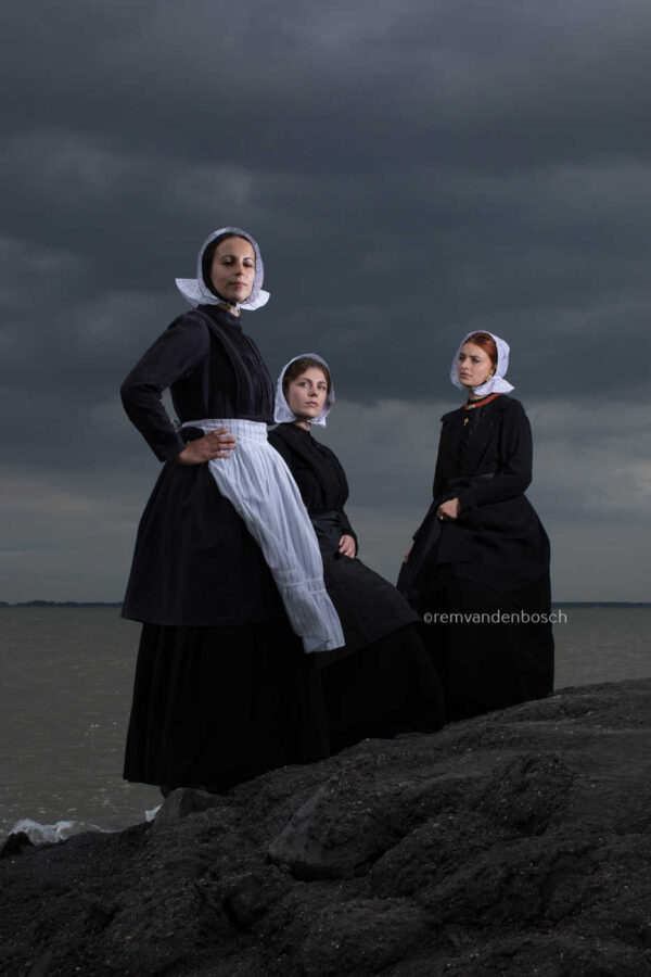 Een samenhorig en krachtig beeld van drie modellen in zwart-witte traditionele dracht, staand aan de kust. De kalme verbinding met de omgeving en de ingetogen kleuren geven dit werk een serene uitstraling.