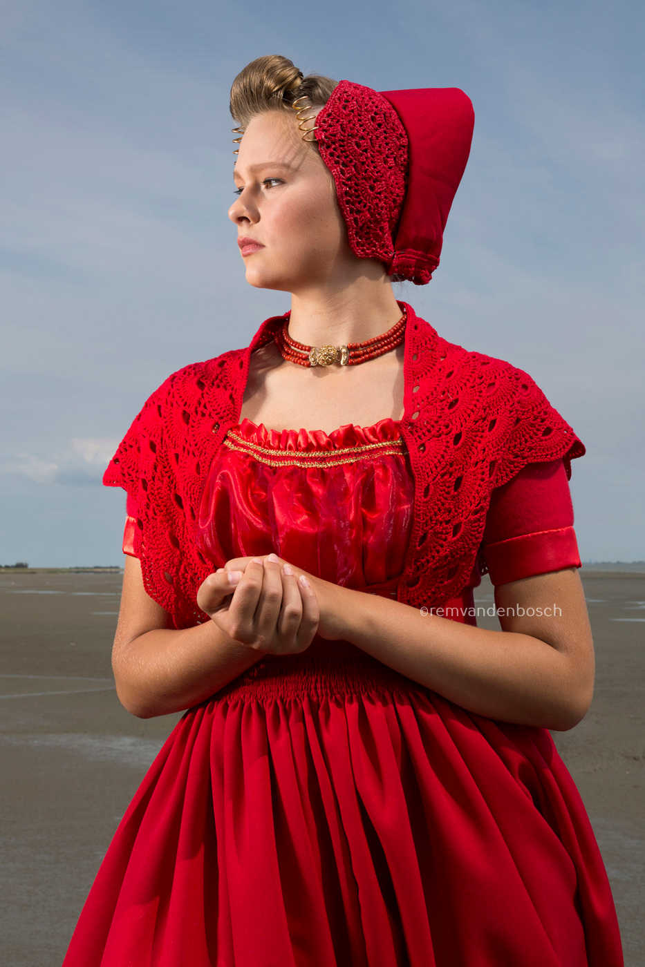 Een harmonieus beeld van Lois in de zee in een moderne rood, roze variant van de Walcherse dracht. De serene kleuren en kalme uitstraling geven het gevoel van verbondenheid en rust aan dit kunstwerk.