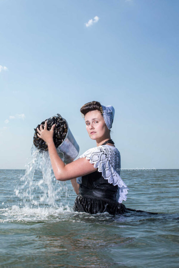 Een kalmerend en sereen beeld van Linde in zwart en witte Walcherse dracht, staande in de zee met een emmer vol mosselen. Het beeld straalt verbondenheid met het water en de natuurlijke omgeving uit.