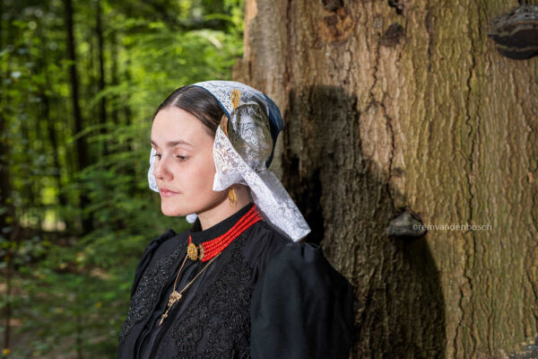 Een close-up portret van een model in zwart en witte dracht van Gooi-en Eemland, met een boomstam op de achtergrond. Het beeld straalt verbondenheid met de natuur en authenticiteit uit.