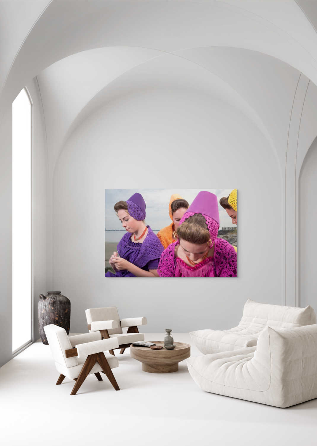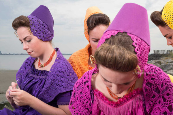 Rem van den Bosch legt in dit levendige beeld de speelse en traditionele sfeer van het buitenleven vast. De vier modellen, gekleed in moderne paarse, roze, gele en oranje Walcherse dracht, handwerken in een natuurlijke omgeving en brengen een gezellige en authentieke uitstraling naar voren. Dit werk is ideaal voor interieurs die een warme en speelse ambiance willen benadrukken.