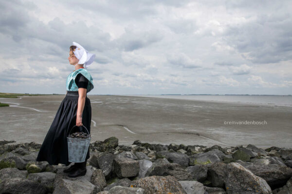 In deze krachtige opname van Rem van den Bosch staat een model in zwarte traditionele dracht van Nieuwland op de rotsen aan de kust. De stoere uitstraling van het beeld benadrukt de stabiliteit en verbondenheid met de zee, een symbool van kracht en vastberadenheid. Rem benadrukt in zijn werk vaak de robuustheid van de natuur, wat zijn foto’s een krachtige, authentieke sfeer geeft.