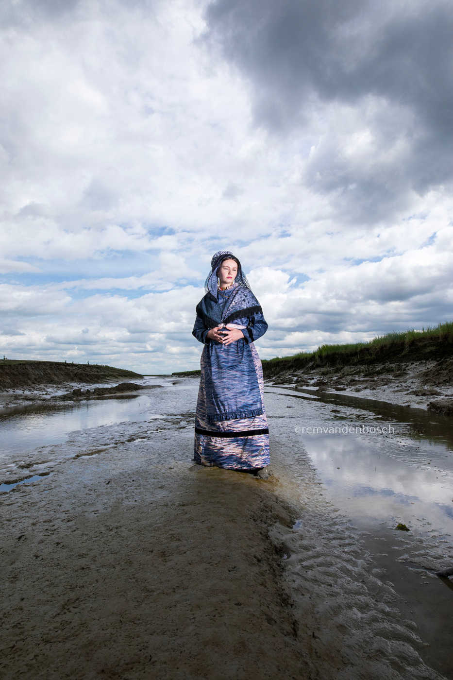 Rem van den Bosch vangt hier de tijdloze kracht van een model in moderne zwarte Walcherse dracht, staand aan de kustlijn. De blije uitstraling van het model, in contrast met de ruwe elementen van de natuur, benadrukt een diepe verbondenheid met de omgeving. Rem’s focus op het tonen van traditie en natuur in harmonie geeft dit werk een krachtige uitstraling. Dit beeld nodigt de kijker uit om de eenvoud en diepgang van de kust te waarderen.