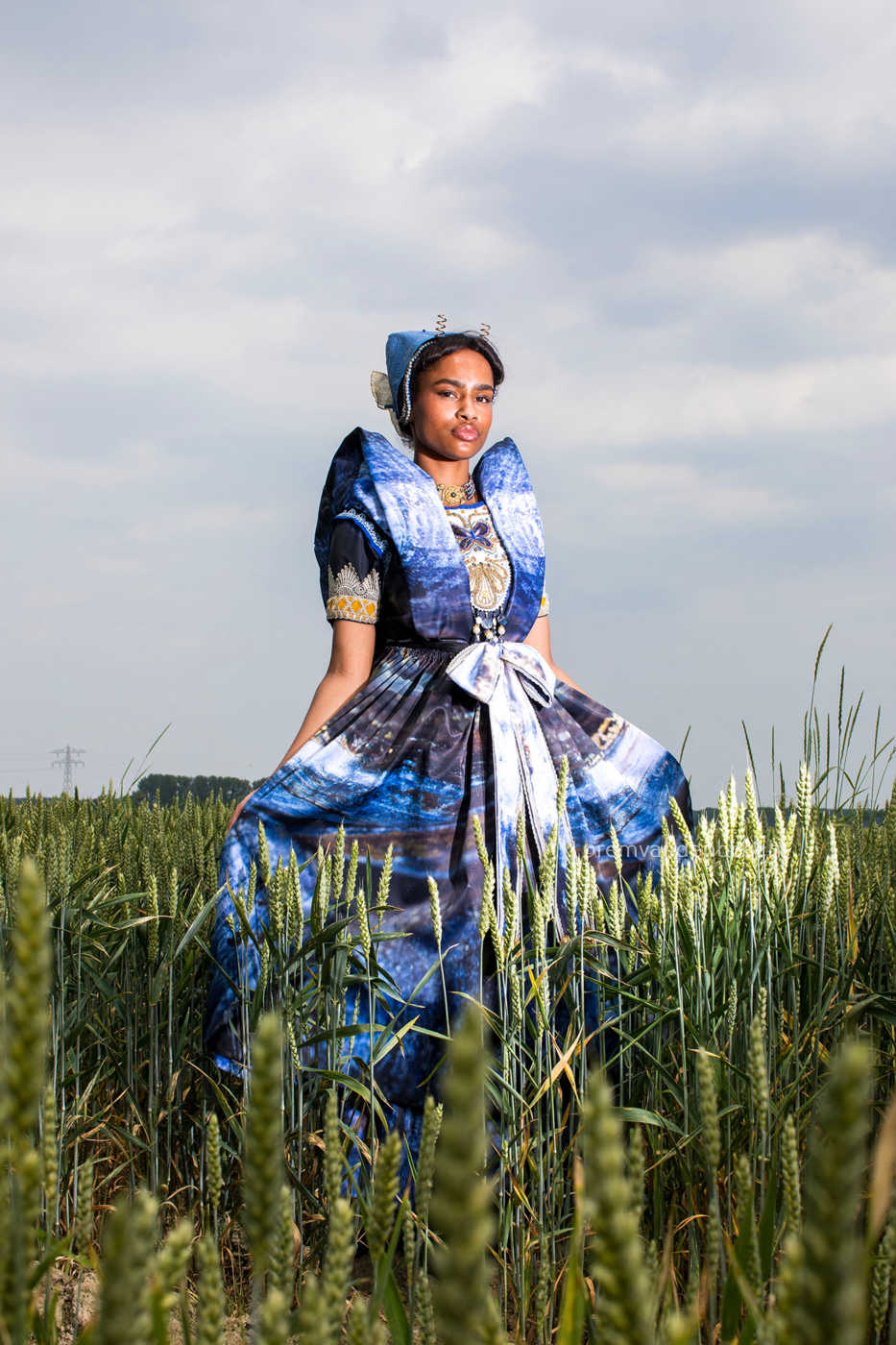 Een krachtig en tijdloos beeld van Phoebe in de moderne zwarte Walcherse dracht, staand aan de kust. De blije uitstraling en de verbondenheid met de natuur geven dit werk een betekenisvolle sfeer.