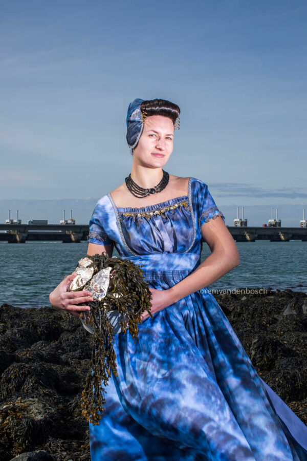 Een krachtig portret van een model in blauwe en witte Walcherse dracht, oesters in een mand met in haar rug de stormvloedkering. Het beeld straalt eenheid met de natuur en vrijheid uit.