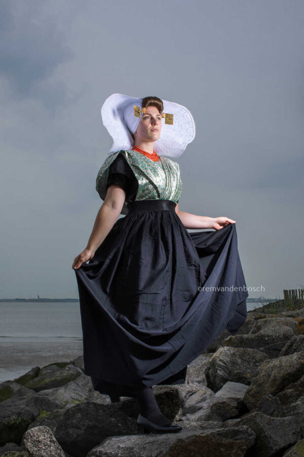 Een krachtig en tijdloos beeld van Janis in de groene dracht van protestants Zuid-Beveland in een rotsachtig landschap, met een sterke verbondenheid met de natuur.