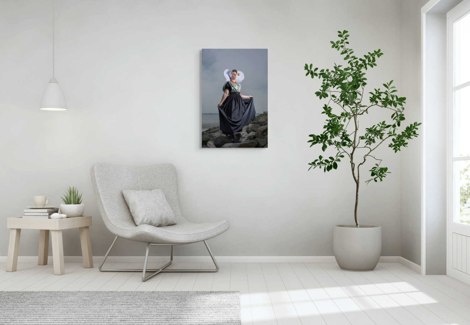 In dit werk van Rem van den Bosch zien we een model in traditionele protestants Zuid-Bevelandse dracht in een rotsachtig landschap. Het beeld straalt kracht en tijdloosheid uit en benadrukt een diepe verbondenheid met de natuurlijke omgeving.