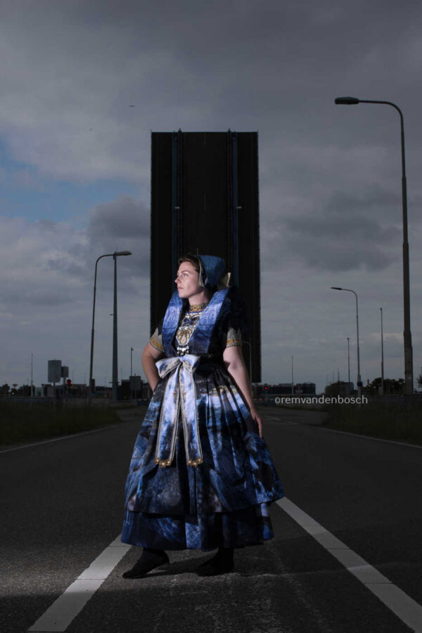 Een intieme close-up van een model in blauw-witte dracht, gefotografeerd bij de sluis. Het beeld straalt verbondenheid met traditie en authenticiteit uit.