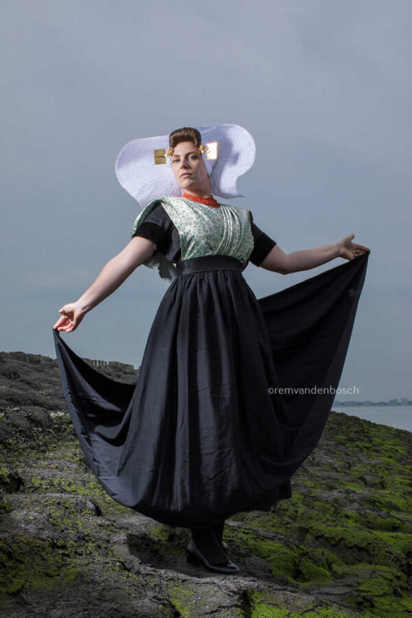 Een diepgaand en rustig beeld van een model in groen-zwarte protestantse Zuid-Bevelandse dracht in een kustgebied, met een kalme, afwachtende uitstraling.