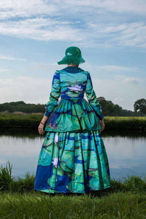 Een model in groen-blauwe traditionele Friese dracht, gefotografeerd bij water. Het beeld straalt harmonie en een gevoel van verbondenheid met de natuur uit.