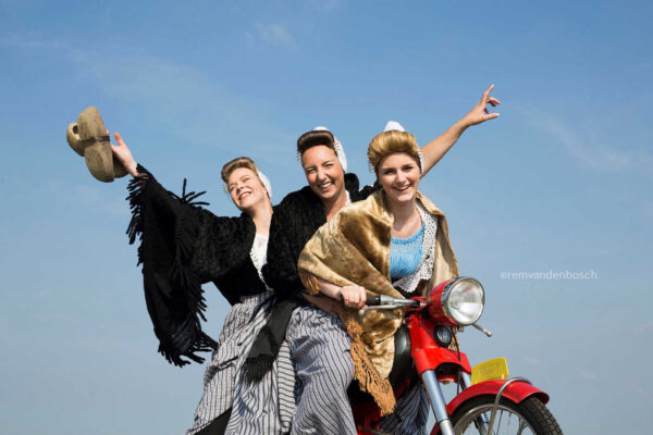 Een vrolijk en speels beeld van drie modellen in Walcherse dracht, samen op de brommer in een kustomgeving. De dynamische compositie en kleurrijke dracht brengen een gevoel van avontuur en vrijheid over.